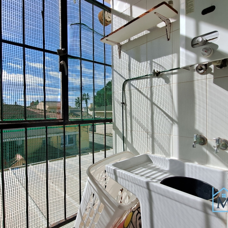The property features three bedrooms, one bathroom, a fully equipped independent kitchen, and a bright living-dining room with a fireplace. It also includes a laundry area and windows fitted with mosquito screens throughout the home.